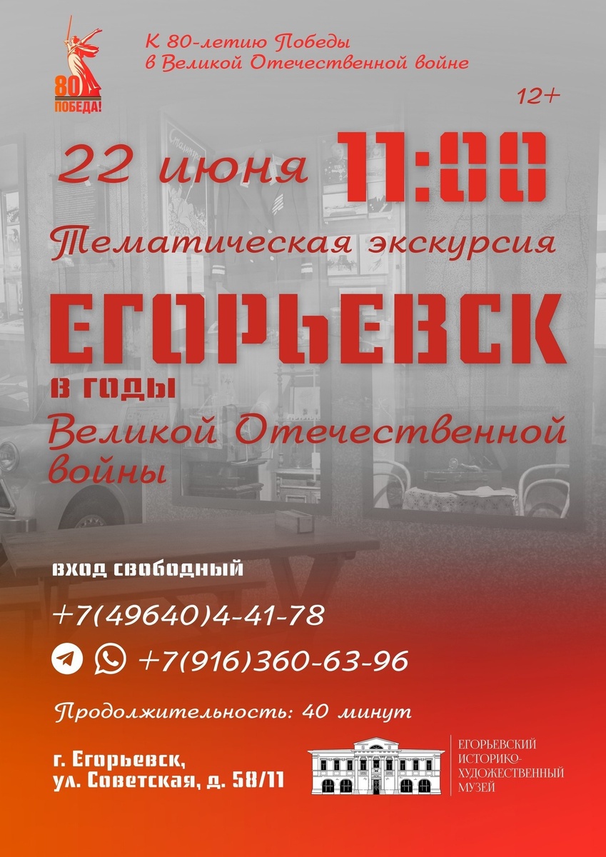 Егорьевский историко – художественный музей приглашает на тематическую экскурсию в отделе истории. Экскурсия посвящена трагическим и великим событиям Великой Отечественной войны, егорьевцам на фронте и в тылу, народному ополчению и строительству оборонительных укреплений, работе егорьевских предприятий и эвакогоспиталей, воинам-егорьевцам. Дата: 22 июня Начало: 11:00. Вход свободный. Место проведения: ул. Советская, д. 58/11. Телефон: +7(49640)4-41-78 #подмосковье #НашеПодмосковье #муниципальныйокругЕгорьевск #моЕгорьевск #егорьевскоетелевидение #егорьевскоетв #Егорьевск #администрацияегорьевск