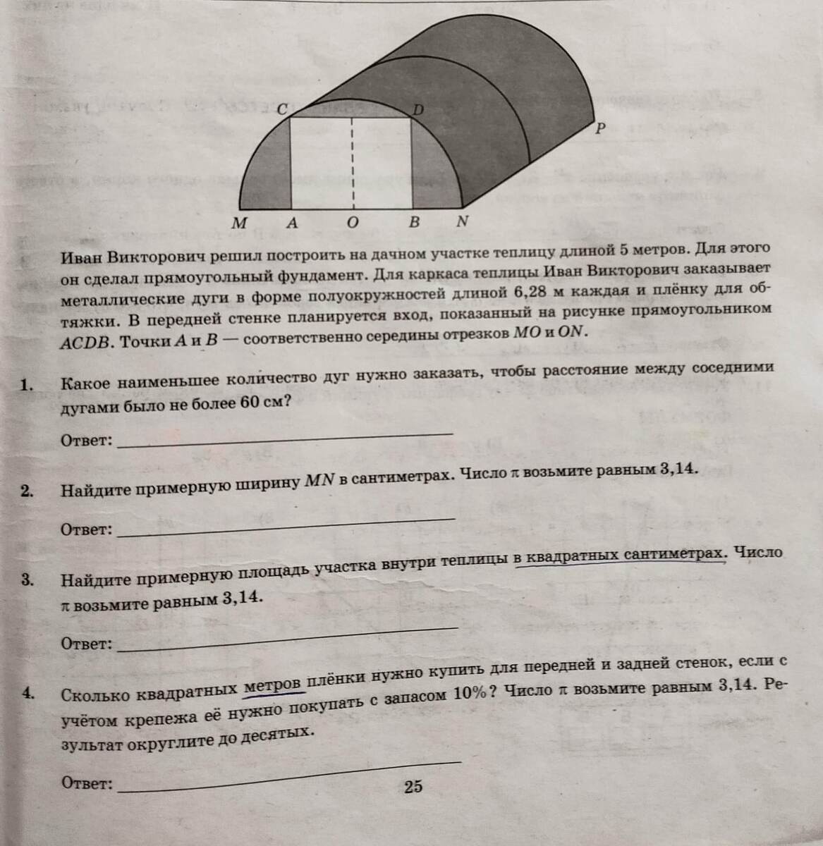 Задание 5: Найдите примерную высоту входа в теплицу в сантиметрах. Число π возьмите равным 3,14. Результат округлите до целых.
