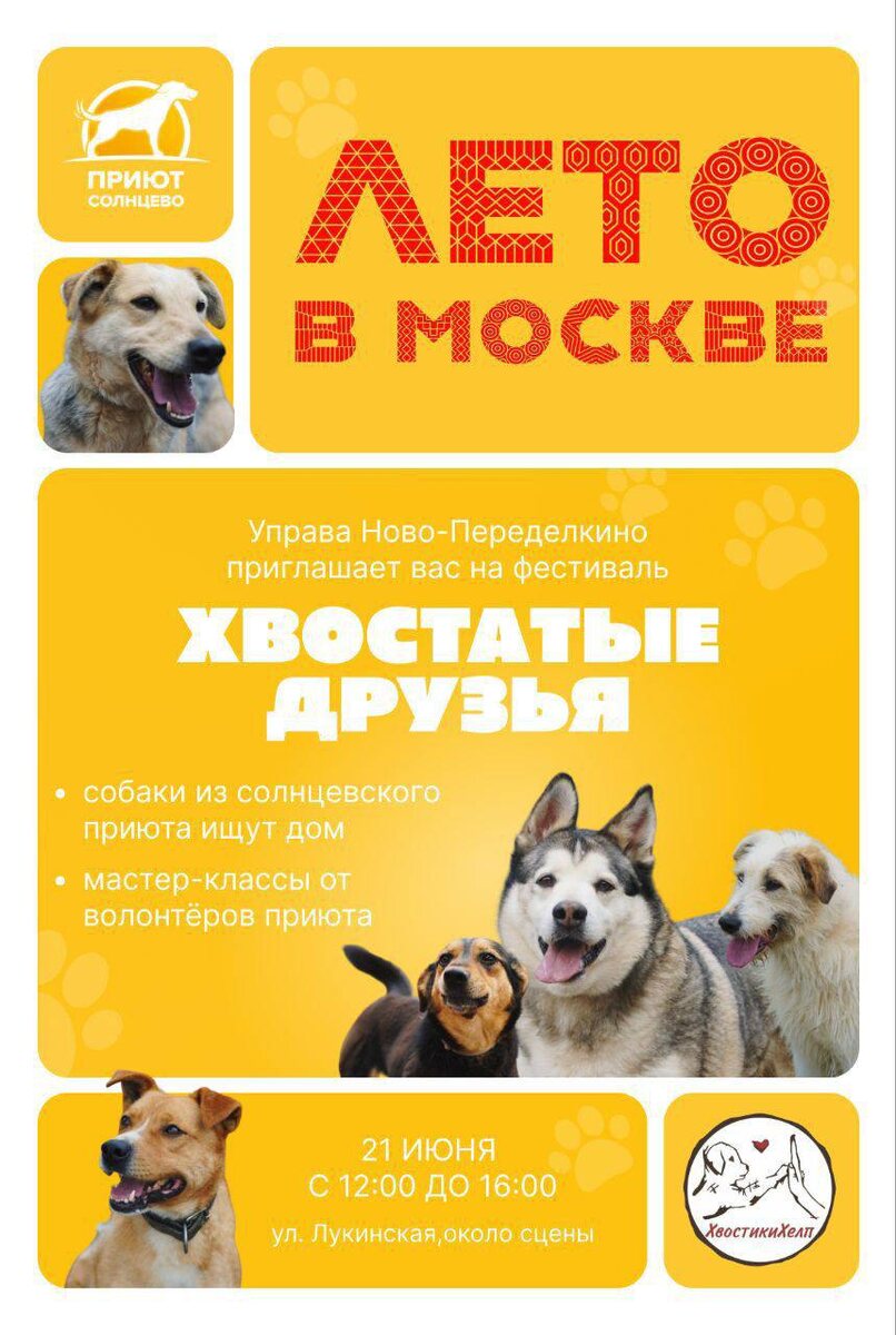 Приглашаем всех на встречу «Хвостатые друзья», где вы можете познакомиться с собаками из приюта «Солнцево» 🌞 Управа Ново-Переделкино предоставила нам площадку около сцены на Лукинской улице для этого замечательного мероприятия В программе 🐾 знакомство с хвостиками из приюта 🐾 рассказы волонтеров приюта о своей деятельности 🐾 мастер-классы от волонтеров 🐾 интерактивная лекция от кинолога- волонтера приюта на тему: "Собака из приюта: мифы, стереотипы и любовь..." 🗓️ 21 июня (суббота) ⏰ с 12-00 до 16-00 🌍 Новопеределкино, сцена на ул. Лукинская Мы анонсируем встречу и скоро познакомим вас с собаками-участниками 🐕🐕🦺🦮🐩 #летовмоскве_хвостатыедрузья #приютсолнцево