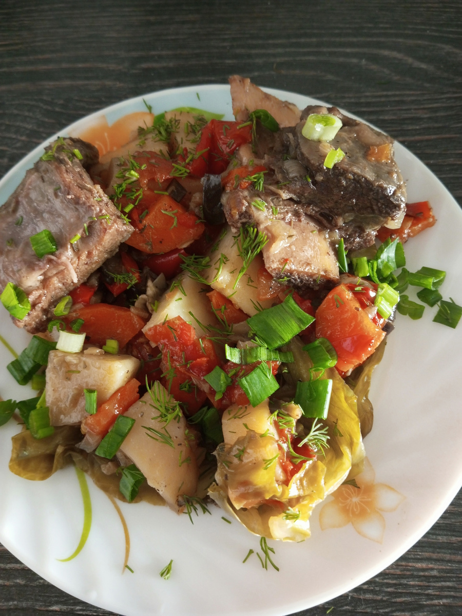 Представляет собой тушёные овощи с мясом и курдючным жиром.