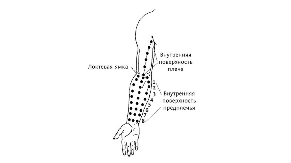 Траектория всех энергетических каналов проходит по конечностям – нижним или верхним. Поэтому надавливание активных точек конечностей имеет энергетическое значение: работа со связанными органами и системами. При этом проекционное значение точек тоже крайне важно. Надавливание служит профилактикой артритов близлежащих суставов. ----------------------------------------- Внутренняя поверхность плеча и предплечья. Энергетика легких и сердца Точки предплечья охватывают меридиан легких, сердца и перикарда. Точки внутренней поверхности плеча проходят по меридиану перикарда. Мысленно проводим линию от центра подмышечной ямки к локтевой ямке (на внутренней стороне локтевого сгиба). На этой линии лежит шесть точек, которые надавливают по 5 секунд двумя совмещенными подушечками больших пальцев. Всего сделаем три прохода по внутренней поверхности плеча. При обычном медицинском массаже локтевые сгибы и сгибы колена не массируются. В практике восточного массажа их используют. Мы тоже будем воздейство