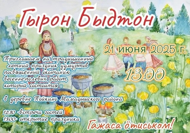 🎉 21 июня приглашаем на традиционный летний праздник удмуртов — ГЫРОН БЫДТОН, посвящённый окончанию весенне-полевых работ! 🌾🌞 📍 Место проведения: деревня Пойкино, Мамадышский район. 🗓 ПРОГРАММА ПРАЗДНИКА 🕧 12:30 — «КУНО ПУМИТАН» — торжественная встреча гостей и делегаций 🕐 13:00 — Официальное открытие праздника «ГЫРОН БЫДТОН» 🎶 «КАПЧИ МЫЛКЫД» — концертная программа фольклорных ансамблей песни и танца. 🎯 «ЫРОН БЫДТОН ШУДОНЪЁС» — развлекательные площадки для всех возрастов. 🎶 ГАЖАСА ӦТИСЬКОМ 0+ ✅ ПОДПИСАТЬСЯ l ПРИСЛАТЬ НОВОСТЬ