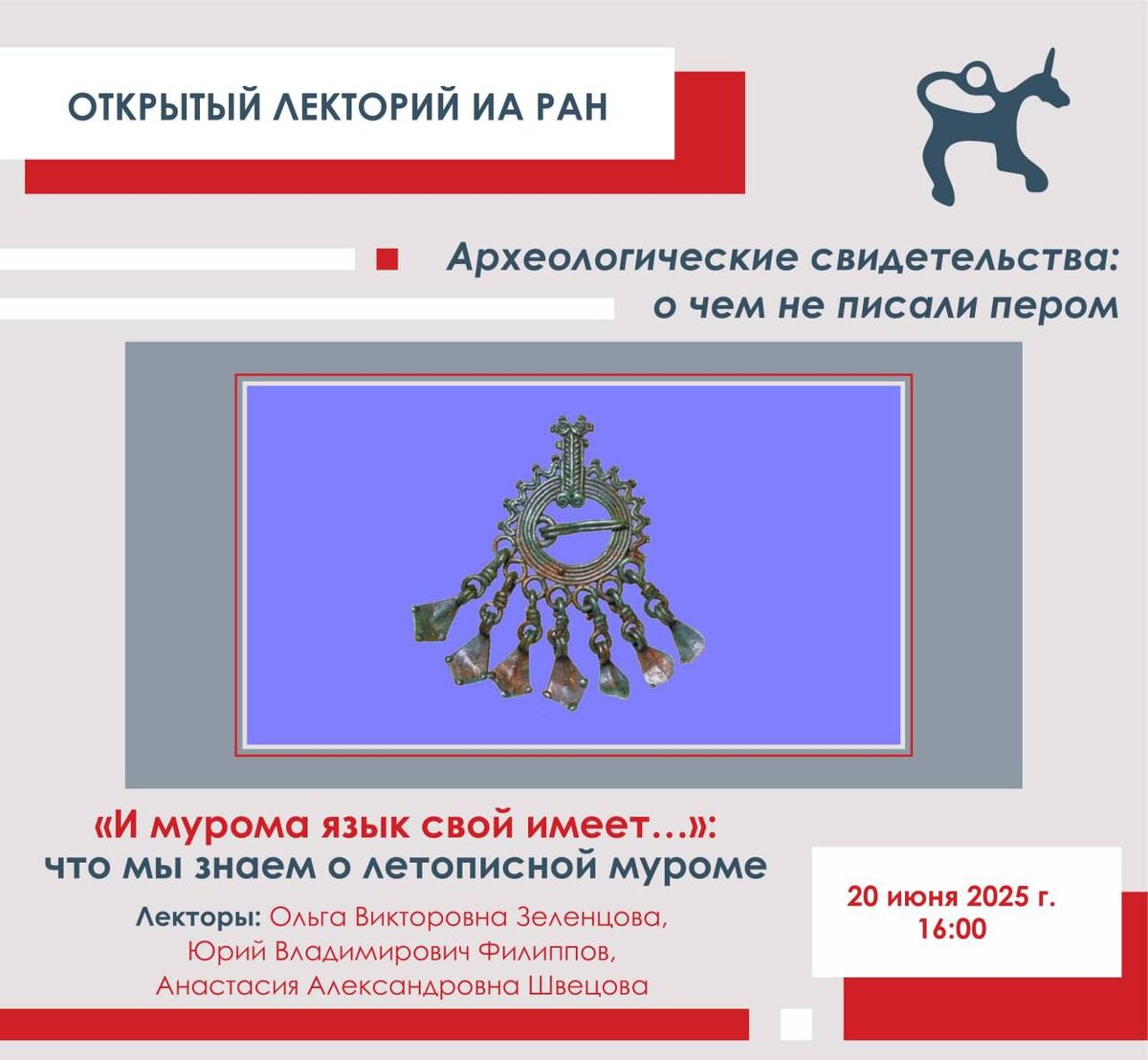 Открытый лекторий ИА РАН 🏺 Уже завтра Институт археологии РАН приглашает студентов ГАУГН и всех желающих на открытую лекцию «И мурома язык свой …»: что мы знаем о летописной муроме»! 🤔 Кто такая мурома и где она жила? Одни считают, что мурома – один из народов поволжских финнов, другие возражают, что его язык неизвестен, и поэтому, возможно, это вовсе не финны, а славяне. Но куда пропала мурома? Растворилась в славянах, пришедших с запада, смешалась с другими финскими народами Волго-Окского междуречья, ушла в леса? 🧑🏻🏫 О том, что на сегодняшний день известно о муроме, и как присоединиться к поискам ее следов, расскажут ученые, изучающие археологические памятники этого летописного народа: - Ольга Зеленцова, старший научный сотрудник отдела сохранения археологического наследия ИА РАН, руководитель Волжской экспедиции ИА РАН; - Юрий Филиппов, генеральный директор Нижегородского музея-заповедника, - Анастасия Швецова, заведующая сектором археологии отдела фондов Нижегородского му