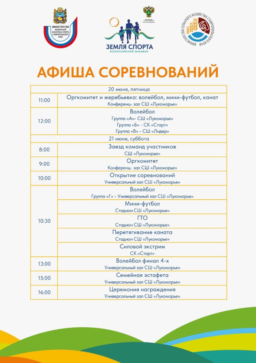 В Будённовске 20–21 июня завершится краевой этап Всероссийского марафона спорта и здорового образа жизнь «Земля спорта». Программа мероприятия включает соревнования по нормативам комплекса ГТО, волейболу, мини-футболу, силовому экстриму, гиревому спорту, перетягиванию каната и другим дисциплинам. Участниками станут представители различных возрастных групп и уровня подготовки. На Ставрополье в течение апреля и мая проходили муниципальные этапы, а по итогам общекраевого раунда состязаний в Прикумье будет сформирована сборная для участия в общероссийском финале. Приглашаем стать гостями спортивного праздника и поддержать спортсменов!