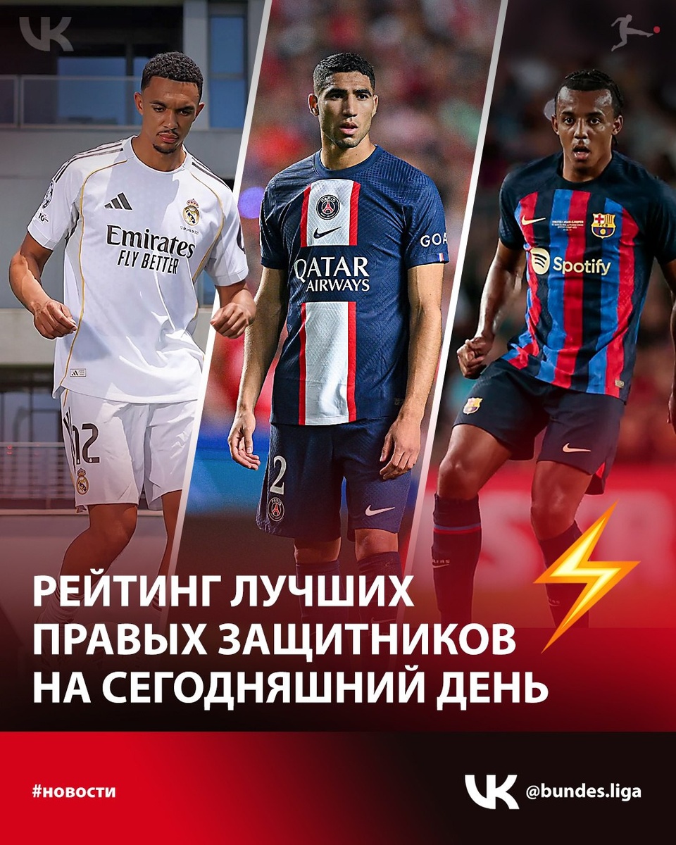 Представителей Бундеслиги нет в топ-10 🤔 Как так? ✌Английский портал FourFourTwo составил рейтинг лучших правых защитников мирового футбола на сегодняшний день. 🥇Первое место - Ашраф Хакими 🥈Второе - Трент Александер-Арнольд 🥉Третье - Жюль Кунде В топ-10 вошли Дензел Думфрис, Жереми Фримпонг, Юрриен Тимбер, Валентино Ливраменто, Даниэль Муньос, Джованни Ди Лоренцо и Педро Порро. А если «по-чесноку», то кто из Бундеслиги мог бы попасть в этот рейтинг кроме Фримпонга, перешедшего в «Ливерпуль»? Или таких нет ... 💬