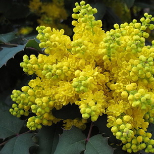 - Прямостоячие соцветия на конце веток появляются после 2-ой декады мая или 1-ой половины июня. Цветы очень ароматные, пестро-желтые. Приятный запах привлекает множество насекомых-опылителей. Иногда осенью магония зацветает повторно.
