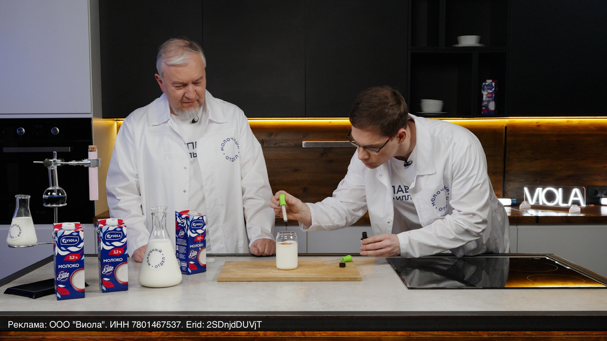 Признавайтесь, пытались ли вы когда-нибудь проверить молочные продукты на натуральность? Испытывали ли популярные в Интернете методы, вроде добавления йода или уксуса в молоко или просвечивания сыра ультрафиолетом? Я вот никогда не пробовал, но давно задумывался, неужели эти “лайфхаки” реально работают? На днях увидел новое шоу «Молочный отдел» от всем известного бренда Viola — оно посвящено проверке именно таких домашних методов. Двое ведущих — врач и научный журналист Алексей Водовозов и иллюзионист Николай Фомушин — разбираются, можно ли в домашних условиях определить качество молочных продуктов и какие методы реально работают, а какие — мифы. В программе — 4 выпуска, каждый из которых посвящён отдельному продукту: молоку, маслу, йогурту и сыру. А теперь расскажу подробнее о каждом эпизоде: Открывает шоу выпуск о самом привычном продукте в холодильнике — молоке. Что покажет капля йода? Реагирует ли молоко на уксус? А правда ли, что если кот не пьёт — значит, что-то не так? Во втор