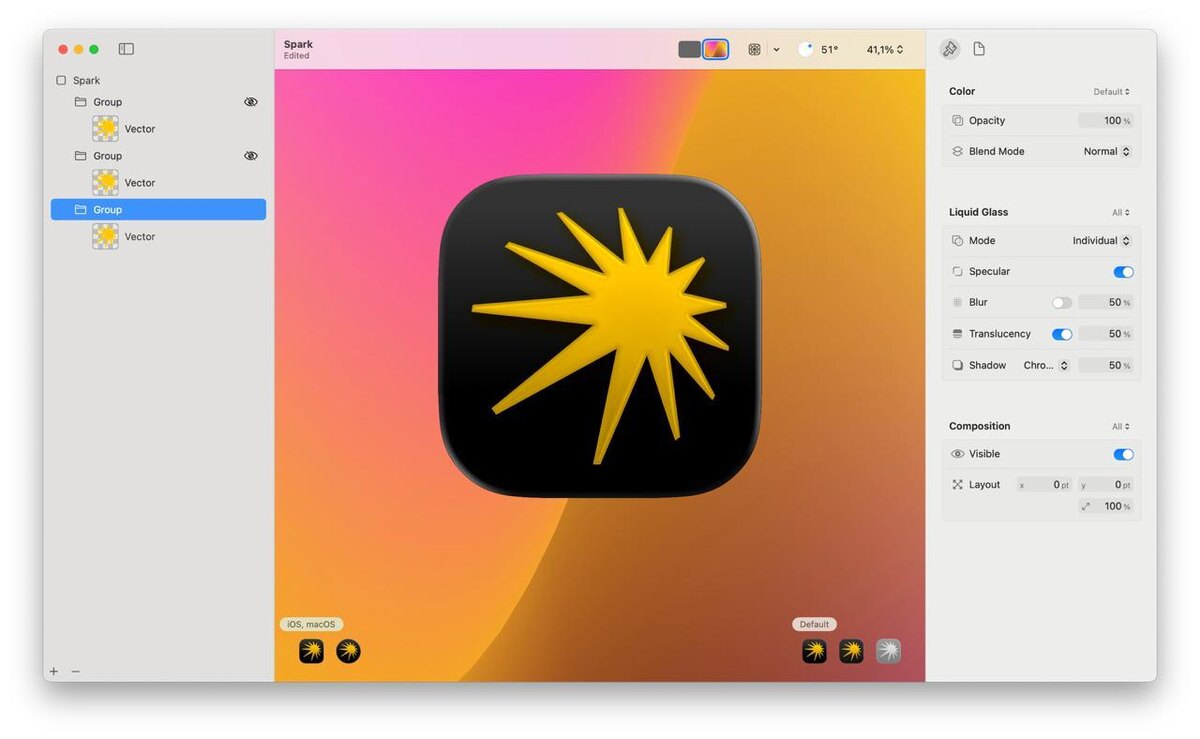 Подробный гайд от Apple как адаптировать иконку под грядущие OS. Вся работа вокруг новых иконок само по себе сильный кейс про дизайн. Перепридумали и сильно изменили свой существующий инструмент. Icon Composer теперь это инструмент, поддерживающий слои и отображающий как будет рендерится будущая иконка в разных условиях. Через него в пару кликов можно подготовить ресурс под все платформы. Без возни в Фотошопе Новый Icon Composer доступен вместе с новым Xcode Просто закидываем в него составные части иконки, крутим подходящие параметры и смотрим как оно будет. У нас вот заметно, делать вспышку прозрачной — можно получить красивые цветные тени от вспышки на фон. Но сама вспышка становится грязной — ей прозрачность не подходит Видео про концепцию новых иконок и какие могут быть варианты адаптации Видео про работу в Icon Composer Бету Xcode скачать тут