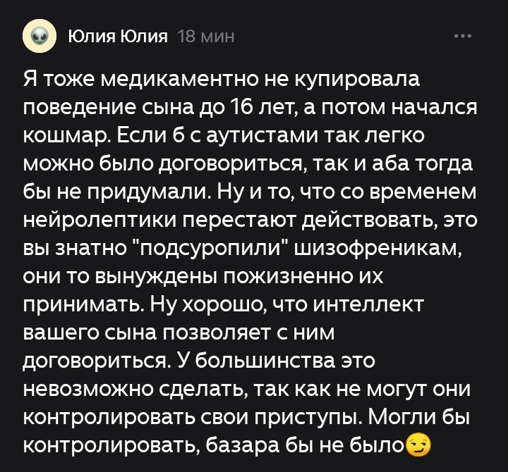 Миг (674). Сегодня получила вот такой комментарий под древней статёй вот этой: Что хочу сказать, кроме "сочувствую Вам, Юлия". А хочу сказать следующее: Спасибо всем мамам взрослых ментальных инвалидов, которые везде, где только можно и не можно мамам малышей или не малышей рассказывают что-то вроде "это у вас сейчас так хорошо, а придёт 16 и начнётся кошмар". Я без иронии благодарю всех вас, дамы, за то, что вы это пишите. Почему? Потому что лично меня это держит в тонусе и не даёт сидеть на облаке иллюзий. И каждый день я думаю о том, что "работай над этим, ибо будет 16...", "делай это, ибо будет 16...", "не сдавайся сейчас, рано, ибо будет 16..." Да, меня мотивирует страх. Спасибо за то, что вы есть. Конец. П.С. Близким подругам с больными маленькими детьми я тоже говорю что-то типа "будет хуже" или "умножь своего малыша на 4, а мозги и поведение оставь такими же"... Как? Бодрит? Заставляет двигаться? Нет? П.С. 2. А у нас появились кольца. Да... идея с висами подтягиваниями вс