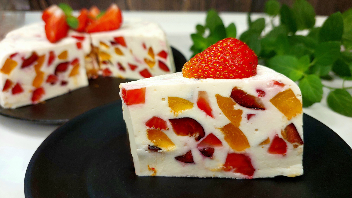 Этот легкий и вкусный десерт можно худеющим и даже на ночь, в ста граммах этого продукта всего 98 ккал, он богат белком и хорошо насыщает, а свежие ягоды это настоящая кладезь витаминов. Отличная альтернатива традиционным тяжелым десертам и сладостям Из указанных ингредиентов получается десерт весом 1 кг, диаметром 17 см, высотой 5 см В первую очередь растворите желатин как указано на упаковке, чтобы у него было время набухнуть Ягоды или фрукты хорошо промойте, удалите косточки и нарежьте небольшими кубиками, мелкие ягоды оставьте целыми, только удалите косточки. Подойдут любые ягоды по сезону или фрукты, можно использовать размороженные В глубокой миске соедините творог, греческий йогурт, сахар и ванильный сахар для аромата. Смешайте ингредиенты погружным блендером до однородности и гладкости, попробуйте массу на вкус, устраивает ли вас сладость. Учитывайте то вы еще добавите сладкие или кислые ягоды. Если блендера нет, протрите творог через сито затем смешайте его с йогуртом и сахар