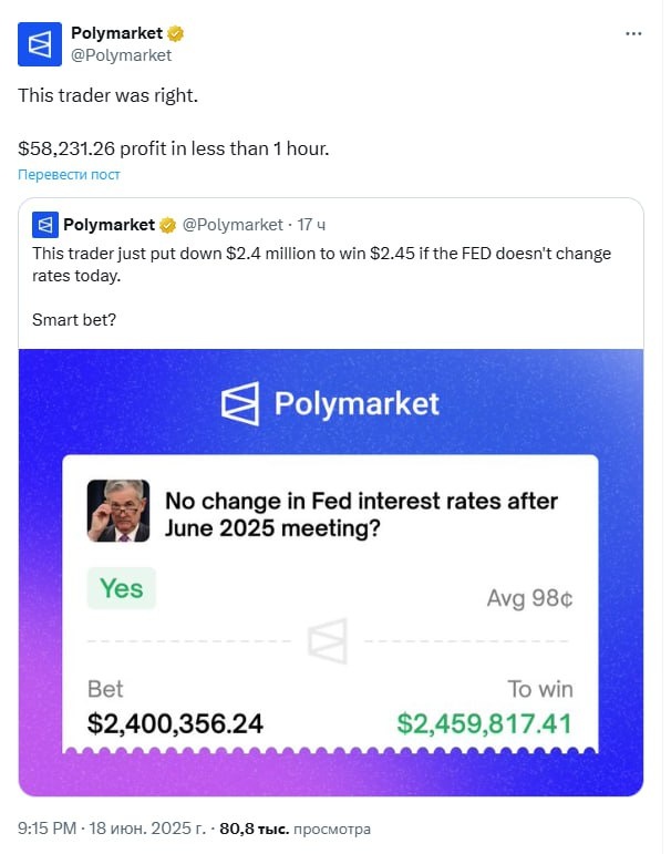 🔸Вчера пользователь Polymarket получил $59 000, сделав ставку на то, что ФРС оставит процентную ставку на том же уровне.