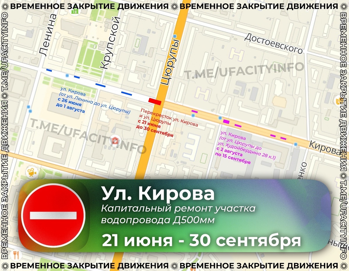 Предстоящий ремонт позволит нарастить мощность, повысить надежность систем водоканала, снизить аварийность и износ сетей. В Уфе на три месяца частично перекроют улицу Кирова. Как сообщает пресс-служба мэрии Уфы, с 21 июня по 30 сентября 2025 года будут перекрыты: Городские службы просят уфимцев и гостей столицы отнестись с пониманием к ограничениям и заранее планировать свои поездки. - По улице Кирова запланирован масштабный ремонт участка водопровода, построенного в 1965 году. Мероприятия будут проведены в рамках реализации национального проекта «Инфраструктура для жизни». Главная его задача – улучшать условия жизни людей и связность территорий России. Одной из инициатив нацпроекта является именно модернизация коммунальной инфраструктуры, - рассказали в мэрии.