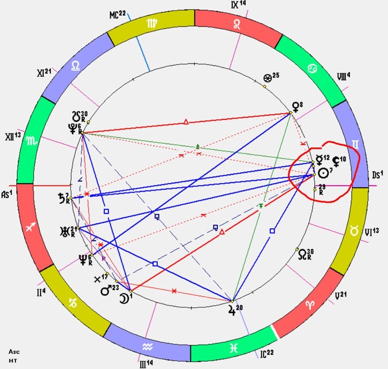 На самом деле что-то не так с тем, КТО критикует, а не с тем, КОГО критикуют... А этот случай интересен тем, что здесь тема детей напрямую обусловлена ситуацией в сфере отношений. Карта женщины. Посмотрите на планеты в доме партнерских отношений (обвела кружочком). Черная Луна вплетается в соединение управителя дома партнерства Меркурия и с Солнцем, сигнификатором мужчины в карте женщины. Это прямое указание на то, что в отношениях происходит что-то специфичное. Что же это? Меркурий в оппозиции с Сатурном, и Солнце в точнейшей оппозиции Сатурном! Планета партнера здесь заблокированы Сатурном из 1 дома в Стрельце, в знаке самооценки, социальных достижений. Очевидно, здесь имеет место крайняя требовательность к людям и постоянная жёсткая критика. Этот не такой, тот не эдакий… Точная оппозиция с Солнцем в 7 доме говорит о том, что эта ситуация носит постоянный характер! Все не такие достойные, как ей хотелось бы. Причем речь может идти не только о мужчине как потенциальном избранни
