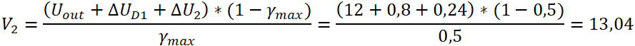где ∆Ud1=0,8 В - падение напряжения на открытом диоде, ∆U2=0,02*12=0,24 В - падение напряжения на активном сопротивлении вторичной обмотки трансформатора, ℽmax=tи/T=0,5 - максимальное значение коэффициента заполнения импульсов напряжения на трансформаторе с учетом формы импульсов для ООП, tи - длительность импульса, Т - период.