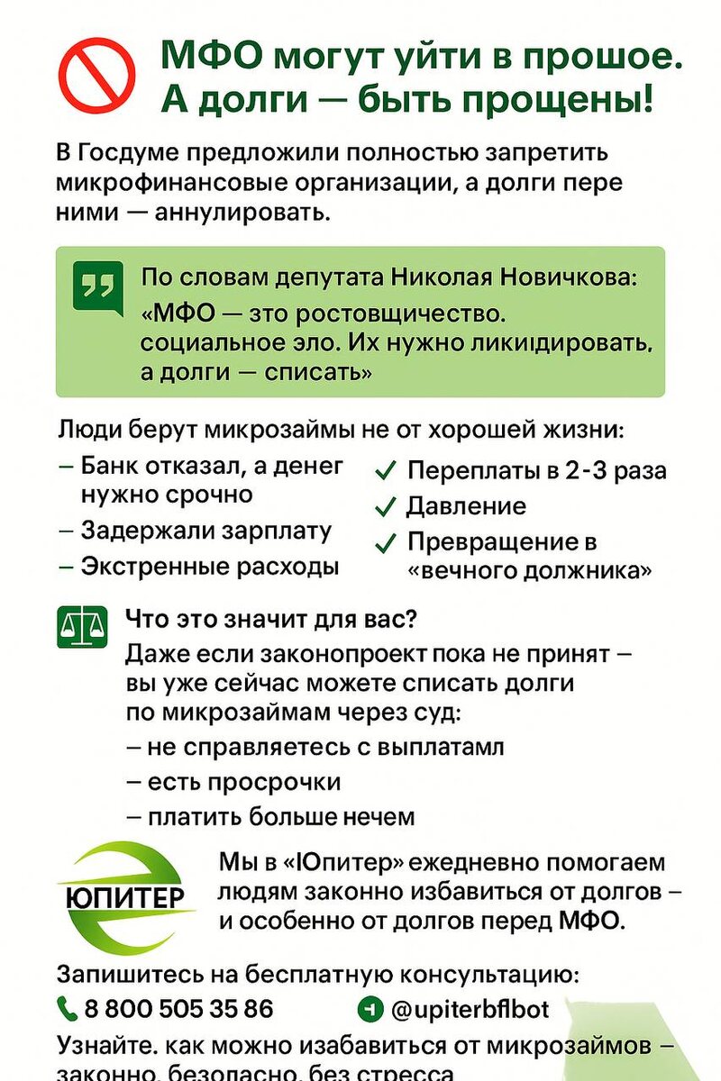 🚫 МФО могут уйти в прошлое. А долги — быть прощены! В Госдуме предложили полностью запретить микрофинансовые организации, а долги перед ними — аннулировать. 📌 По словам депутата Николая Новичкова: «МФО — это ростовщичество, социальное зло. Их нужно ликвидировать, а долги — списать». 📉 Люди берут микрозаймы не от хорошей жизни: — Банк отказал, а денег нужно срочно — Задержали зарплату — Экстренные расходы Но что в итоге? ✔️ Переплаты в 2–3 раза ✔️ Давление ✔️ Превращение в «вечного должника» ⚖️ Что это значит для вас? Даже если законопроект пока не принят — вы уже сейчас можете списать долги по микрозаймам через суд, если: – не справляетесь с выплатами – есть просрочки – платить больше нечем 👉 Мы в «Юпитер» ежедневно помогаем людям законно избавиться от долгов — и особенно от долгов перед МФО. 📲 Запишитесь на бесплатную консультацию: 📞 88005053586 🤖 @upiterbflbot 🔹 Узнайте, как можно избавиться от микрозаймов — законно, безопасно, без стресса.