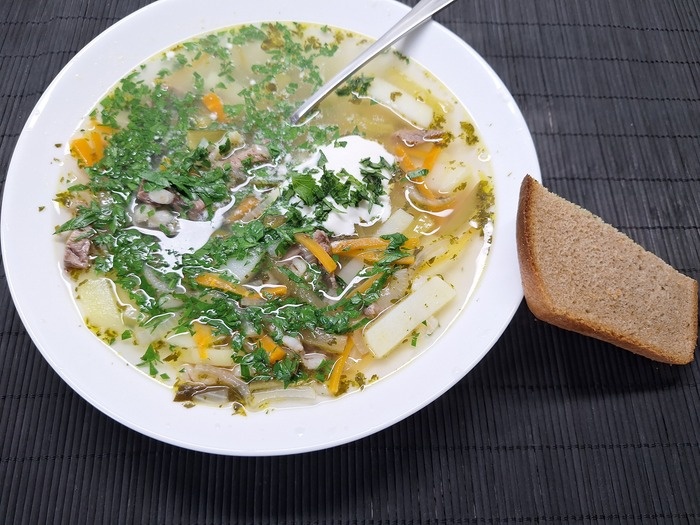 Приветствую вас уважаемый читатель! В данном посте я хотел поделиться с вами тем, как я впервые готовил суп "рассольник ленинградский". Собирая информацию в интернете и книгах, я понял, что это адаптированная под нужды и реалии своего времени версия рассольника "московского", только без деликатесов. Тем не менее эта версия стала популярной и любимой многими. Ингредиенты: Говядина: 600 граммов. Вода 3 литра Картофель 4 шт. Лук 2 шт. (Одна для бульона, необязательно). Морковь 2 шт. (Одна для бульона, необязательно). Перловка 100 граммов. Масло растительное/сливочное. Огурцы солёные (маринованные). штук 5. Соль, перец, лавровый лист. Зелень сушёная/свежая. Бульон: Ну, всё как обычно, бульон как бульон. Говядина, вода, соль, специи. Я посолю позже. Варил говядину чуть больше часа, полчаса из них со специями, луком и морковью. Мясо либо в суп, либо отдельно. Я нарезал в суп. Перловку - отмерил 100 граммов и в бульон вариться. Перловка будет вариться минут 50. Зажарка: Сначала лук до полупро