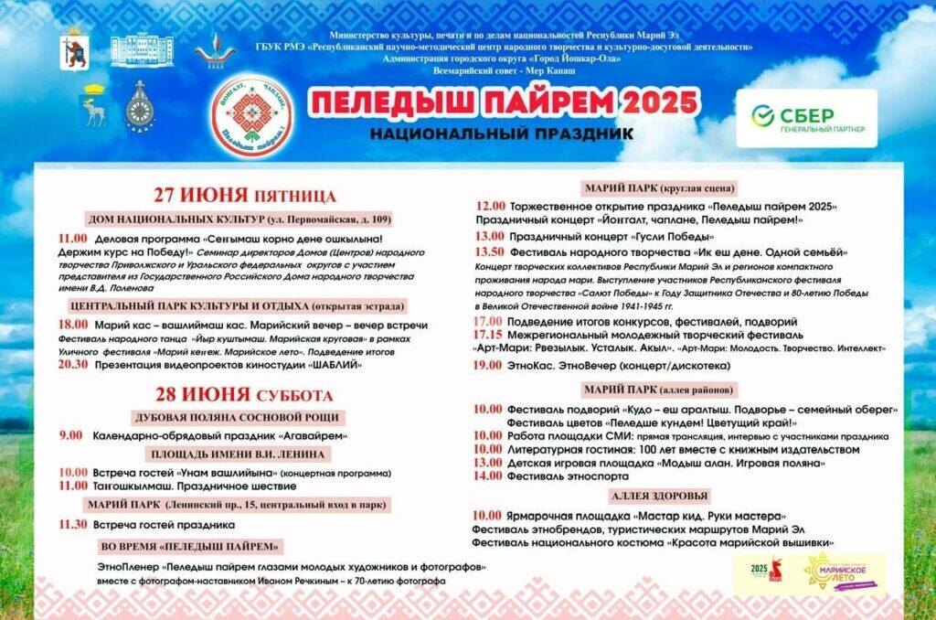 27 и 28 июня в Йошкар-Оле отпразднуют марийский национальный праздник «Пеледыш пайрем». Основной площадкой для празднования в этом году будет Марий парк. Праздник посвящен Году защитника Отечества в России и 80-летию Победы в Великой Отечественной войне, а также направлен на сохранение исторической памяти и национальных традиций. 27 июня в Доме национальных культур состоится деловая программа, а в Центральном парке пройдёт марийский вечер встреч и традиционная «круговая». Основной день мероприятий намечен на 28 июня.