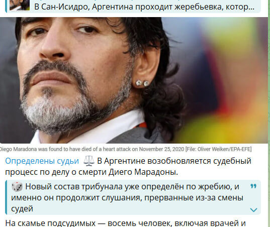 Определены судьи ⚖️ В Аргентине возобновляется судебный процесс по делу о смерти Диего Марадоны. 🎲 Новый состав трибунала уже определён по жребию, и именно он продолжит слушания, прерванные из-за смены судей "А суди кто?" Судьями, ведущими новое судебное разбирательство, будут Roberto Gaig, Alejandro Lago y Alberto Ortolani На скамье подсудимых — восемь человек, включая врачей и медсестёр, обвиняемых в халатности, приведшей к гибели легенды футбола в 2020 г.