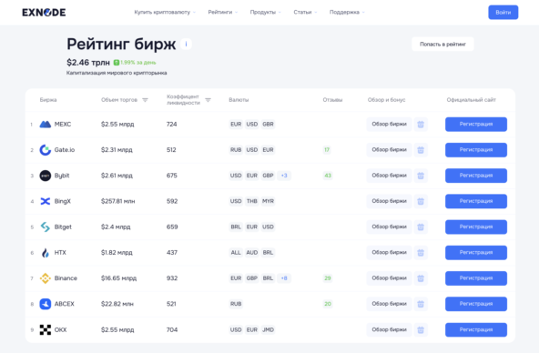 Важно понимать: не все биржи одинаково удобны и безопасны. Некоторые предоставляют мгновенный доступ к сделкам и отображают онлайн курс криптовалют на бирже, другие делают акцент на низких комиссиях или широкой поддержке фиатных валют. Разобраться во всем этом многообразии помогает Exnode — рейтинг криптовалютных бирж, где собраны все актуальные платформы, доступные для россиян в 2025 году. Здесь можно сравнить условия, изучить особенности каждой площадки и выбрать оптимальное решение под свои цели.