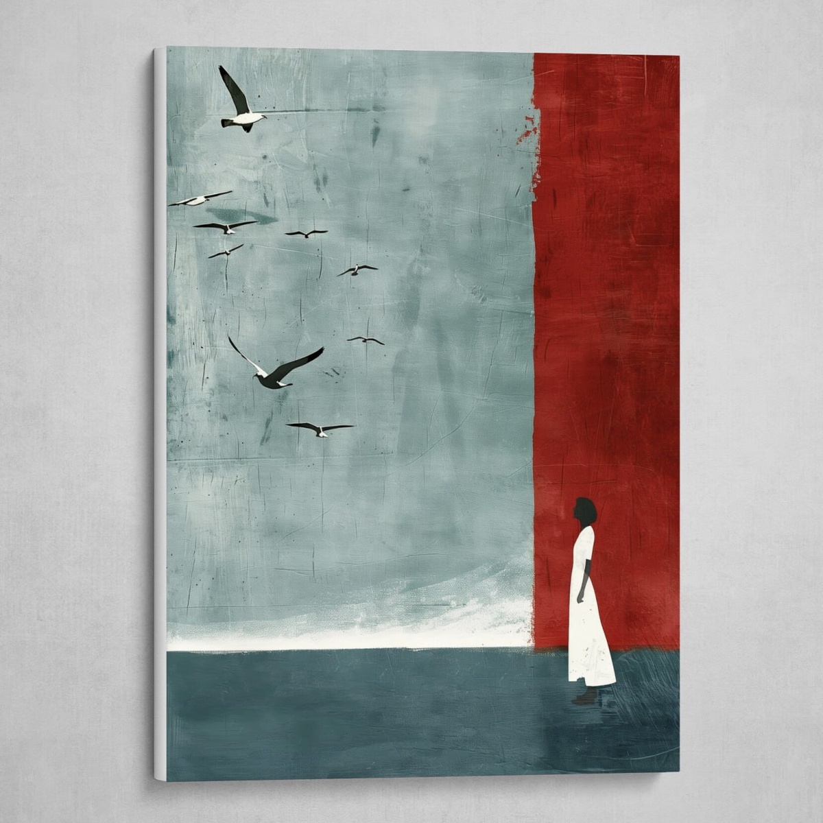 Безмятежность как взгляд внутрь себя, туда, где заканчиваются стены и начинается небо. Девушка в белом платье стоит у границы алой стены, словно на пороге нового мира. Перед ней небесная ширь и стая птиц, уносящихся ввысь, в неведомое. Это не сцена, а чувство: момент, когда ты стоишь перед свободой — тревожной, манящей, неотвратимой. Красный — как прошлое, что ещё греет спину. Синева — как будущее, где есть ветер, тишина и полёт. А сама героиня — символ решимости отпустить.