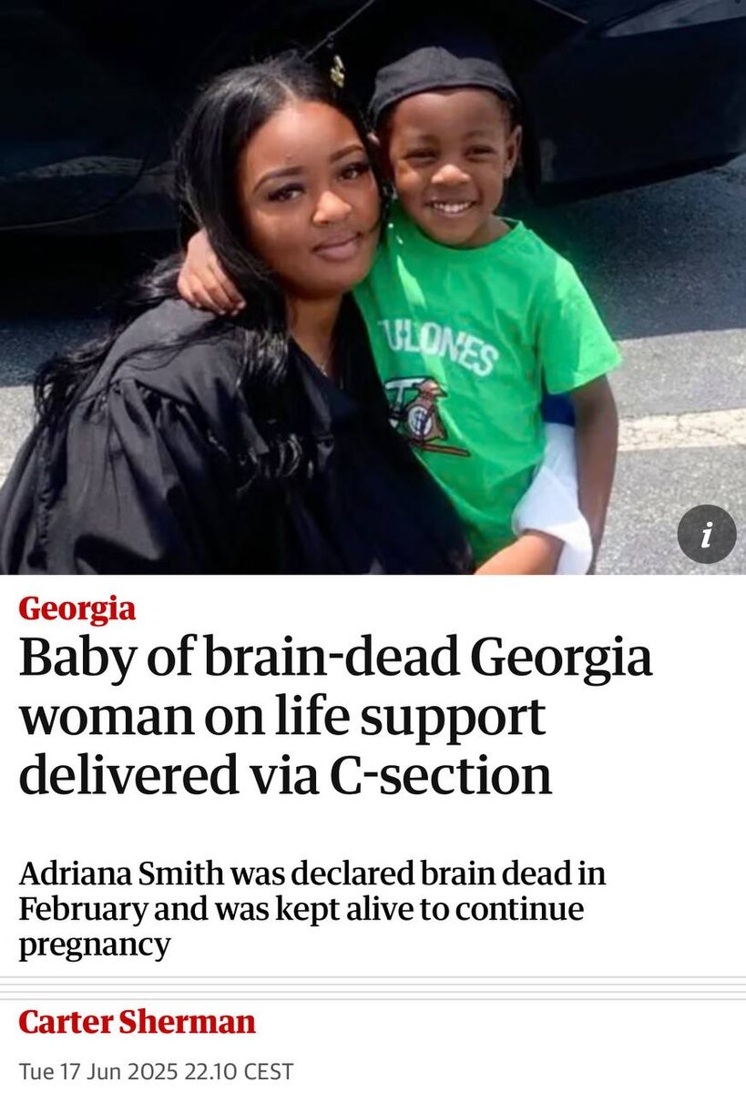 🩺🇺🇸 В США мёртвая женщина родила ребёнка — из-за закона против абортов 30-летняя Адриана Смит была признана мёртвой (смерть мозга) ещё в феврале, но врачи в штате Джорджия не отключили её от аппаратов, сославшись на запрет абортов. Семье не дали выбора. 13 июня женщине сделали кесарево сечение. Родился мальчик весом 800 г — он жив, в реанимации. ⚖️ Позже прокуратура заявила: закон не обязывает держать мёртвую женщину «в живых». 💬 В соцсетях уже пишут: «Адриану превратили в инкубатор». Скандал набирает обороты. @eNewsmd.online