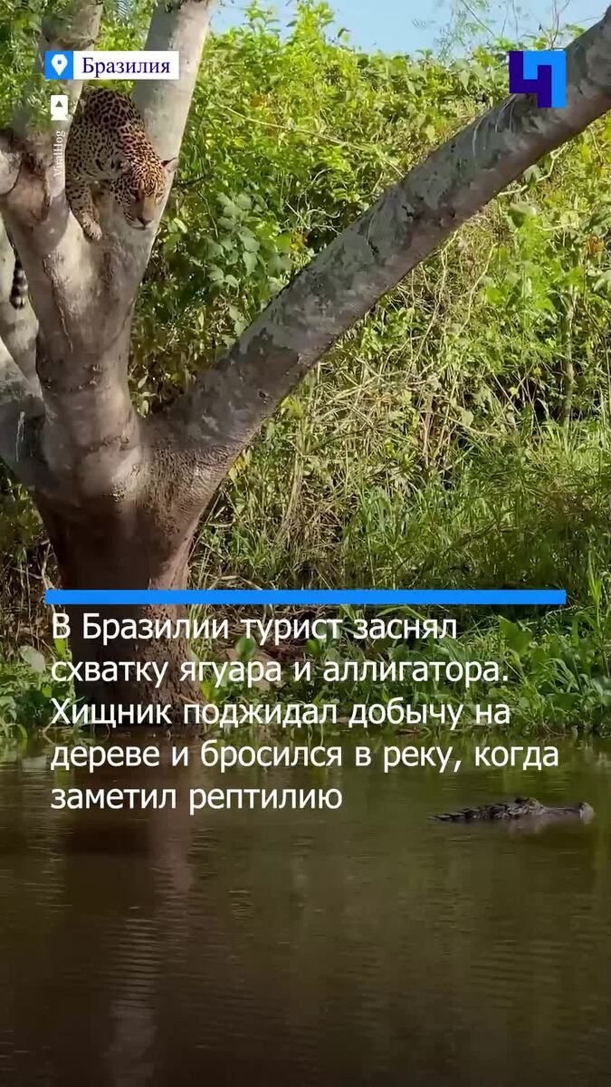 В джунглях штата Мату-Гросу-ду-Сул ягуар атаковал аллигатора прямо в воде. Момент схватки удалось запечатлеть туристу Итало Гарсии Алвесу, который провел в засаде 4 часа 11 минут. На видео видно, как хищник наблюдает с дерева, затем бросается в реку и вступает в борьбу с рептилией. Животные исчезают под водой, снова всплывают, и спустя несколько минут ягуар выходит на берег, оставив добычу. Автор кадра назвал встречу незабываемой. По его словам, оба участника поединка выжили.