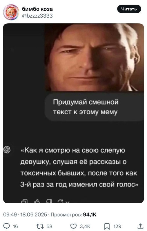 🤖 CHATGPT ОСВОИЛ ЧЁРНЫЙ ЮМОР: ШУТКИ ПО НОВОМУ УРОВНЮ Кажется, ИИ теперь не только умный, но и с острым чувством юмора. ChatGPT научился шутить так, что порой его шутки могут вызвать смешанные чувства – от смеха до легкого недоумения. Почему это важно? Чёрный юмор – это не просто способ рассмешить, а инструмент для работы с сложными темами. ChatGPT теперь может помочь в создании контента, где нужна ирония или сарказм. Как это применить? Например, для креативных сценариев, сторителлинга или даже маркетинговых кампаний, где требуется нестандартный подход. Смотри скрин – там всё наглядно 😏 А ты уже пробовал такие шутки? Делись опытом! #ChatGPT #ИИ #Юмор | ВСЁ ПРО AI | AI NEWS | Дзен | ОК