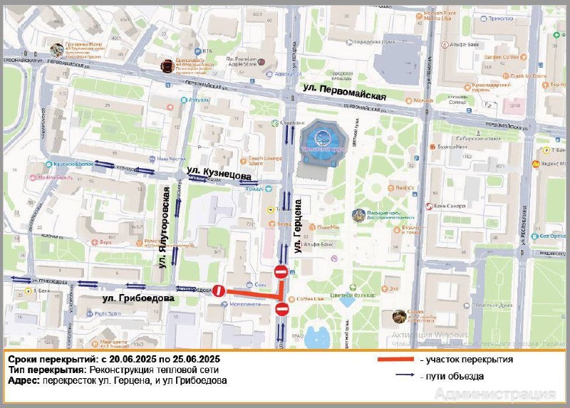 ⛔️ Дороги перекроют в центре Тюмени Участок улицы на перекрестке Герцена — Грибоедова закроют для проезда с 20 по 25 июня. Причина - ремонт трубопровода тепловой сети.