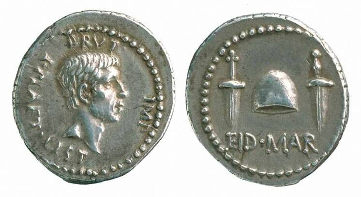 Марк Юний Брут, непосредственный участник убийства Цезаря, увековечил это знаменательное событие на монете, отчеканенной спустя год после
