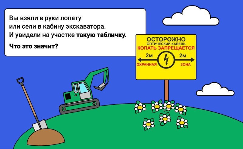 Знаете ли вы, что повреждение подземного кабеля обычной лопатой может оставить тысячи людей без связи? Виновника ожидает крупный штраф или даже уголовное наказание. Следование простым правилам поможет избежать этого. Мы собрали советы в карточках - прочитайте и поделитесь с друзьями.