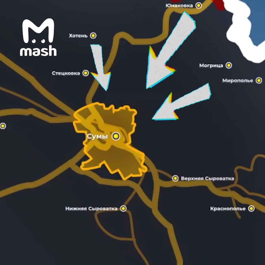 По информации Mash, российские военные в 15 километрах от Сум. Они активно наступают в область по трём направлениям: