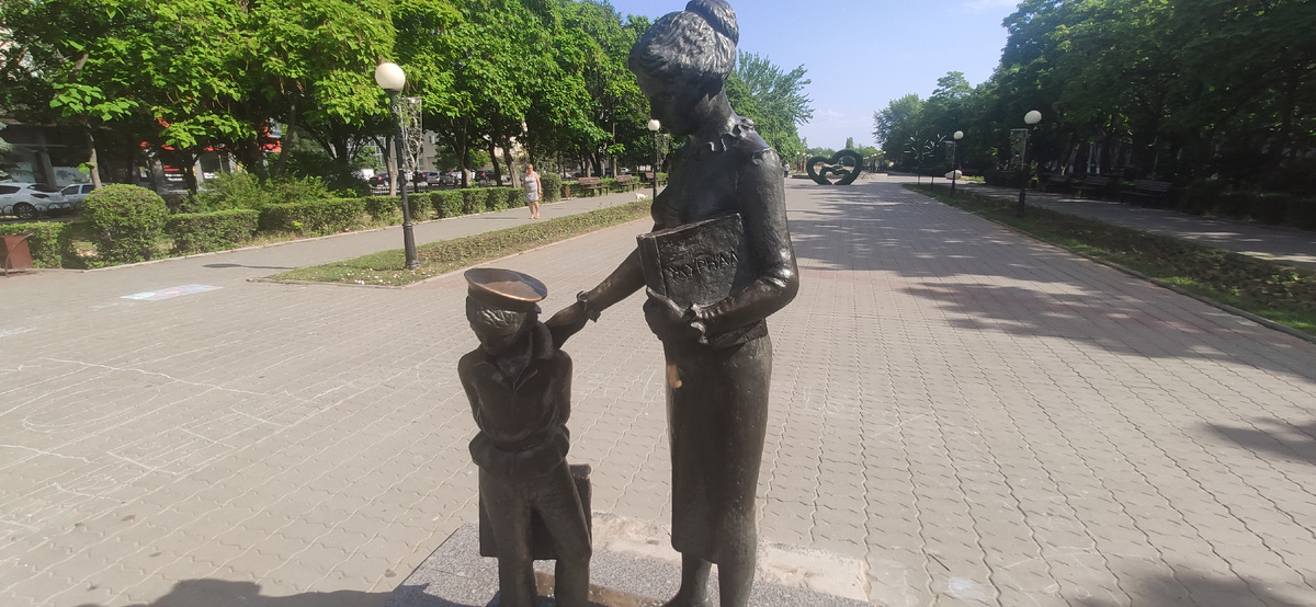 Здравствуйте, дорогие читатели сегодня продолжим рассказывать о достопримечательностях нашего бульвара Энгельса в Красноармейском районе. Бронзовая скульптурная композиция была открыта 5 октября 2010 года. Она изображает учительницу и её ученика. В руках педагога — журнал и указка, главные атрибуты этой профессии. Мальчик одет в советскую гимнастёрку, в руках школьный портфель, а перед ним выложены «пятнашки». Автор памятника — Анатолий Пахота. Он признаётся, что образ учительницы, бережно держащей за плечо ученика, навеян его собственными воспоминаниями. В образе мальчика, прячущего портфель за спиной, скульптор попытался передать самого себя в детстве. Дети с очень бо́льшим азартом и интересном играть около неё в классики , создавая постоянный приятный шум своим радостными возгласами. Действительно очень добрый и несмотря на немного грустную атмосферу , всё же светлый памятник. Знак уважения к Учителям. Вызывает какие-то искренне детские и добрые эмоции. Да, я всегда вспоминаю
