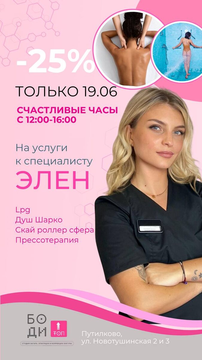 ✨ СЧАСТЛИВЫЕ ЧАСЫ С ЭЛЕН! ✨ 🎉 Только 19.06 с 12:00 до 16:00 🌸 Успейте записаться по СПЕЦИАЛЬНОЙ ЦЕНЕ — 25% СКИДКИ! 💆♀️ На услуги к специалисту: 🔹 LPG-массаж 🔹 Душ Шарко 🔹 Скай роллер Сфера 🔹 Прессотерапия 💫 Идеальное время позаботиться о себе с удовольствием и выгодой! 📅 Дата: 19 июня 🕐 Время: 12:00 – 16:00 📍 Место: Путилково, ул. Новотушинская, 3 👩⚕️ Специалист — ЭЛЕН 💥 Количество мест ограничено! 📲 Записывайтесь скорее! https://n960947.yclients.com