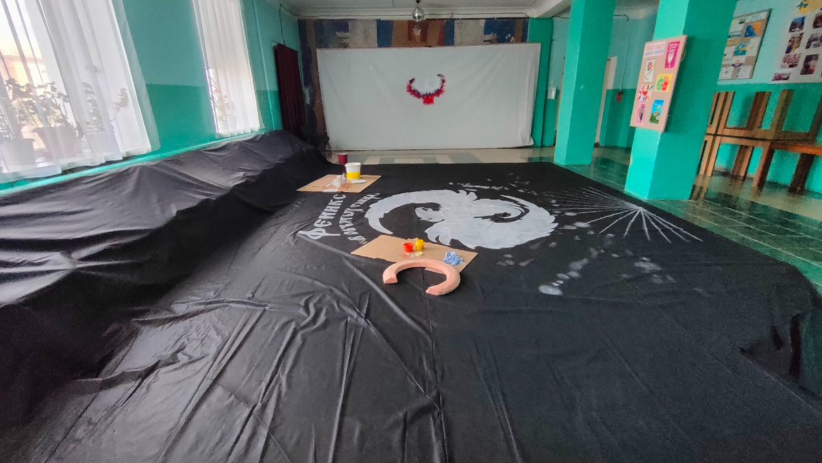 Привет! С утра солнечный свет настраивает на позитивный лад. Солнце дарит тепло и ты идёшь такой в майке и поглощаешь витамин D, настроение улучшается)). На работу. Мне нравится моя работа, но бывают исключения ))). Бывают трудности. Вот сейчас пара трудных дней, мне нужно создать на сцену задник, размеры 6х7 метров, рисовать на материале. Вся трудность в свободном месте на работе, нет таких пространств где можно разложиться, точнее они есть, но постоянно кому-то нужны, а моя работа требует времени ... Ещё трудность, что рисовать приходится на коленках. Два дня на коленях по восемь часов, мои мышцы ног и коленные суставы просят пощады ))). Такая работа иногда Застрелил все фойе, рисую, сначала в один день первым слоем Потом второй день цветной слой А потом на сцену вешать. Пока работал прилетел ветер, возможно и с восточной стороны, шапку не сорвал с буйной головы, но принялся наводить свои порядки Стал трепать кусты и деревья, возможно хотел из причесать по своему. Птицы стихли и п