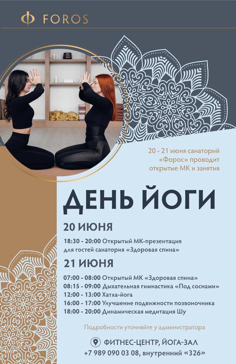 🧘♀️ ДЕНЬ ЙОГИ В ФОРОСЕ 20–21 июня приглашаем вас в санаторий «Форос» на открытые мастер-классы и занятия, посвящённые Международному дню йоги. Это прекрасная возможность почувствовать гармонию с собой и природой, зарядиться энергией и позаботиться о здоровье. ✨ Программа: 📅 20 июня 18:30–20:00 — Открытый МК-презентация «Здоровая спина» для гостей санатория 📅 21 июня 07:00–08:00 — МК «Здоровая спина» 08:15–09:00 — Дыхательная гимнастика «Под соснами» 12:00–13:00 — Хатха-йога 16:00–17:00 — Улучшение подвижности позвоночника 18:00–20:00 — Динамическая медитация Шу 📍 Фитнес-центр, йога-зал 📞 +7 989 090 03 08 (внутренний «326») Приходите, даже если вы никогда не занимались йогой — занятия подойдут для любого уровня подготовки. Посетить мероприятия могут гости санатория по предварительной записи на стойках фитнес-центра