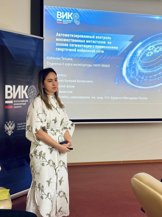 Выпускница Инженерно-физического института биомедицины (ИФИБ) МИФИ Татьяна Кобякова разработала проект, который поможет в диагностике метастазов в головной мозг. Проект Татьяны Кобяковой по автоматическому анализу МРТ-снимков с использованием искусственного интеллекта стал призером на завершившемся недавно Всероссийском инженерном конкурсе, и в перспективе может превратиться в реальное решение для онкологии. Метастазы в головной мозг — это вторичные опухоли, возникающие, когда рак из других органов распространяется в мозг. Они диагностируются у 20–40% онкологических пациентов. Метастазы вызывают серьёзные симптомы: головные боли, судороги, нарушения памяти и координации. Без своевременной диагностики они могут привести к тяжелым последствиям. Традиционная диагностика метастазов сложна: радиологи тратят до 40 минут на анализ одного МРТ-снимка, чтобы выявить и оценить опухоли. Мелкие очаги размером в несколько миллиметров часто остаются незамеченными, а человеческий фактор увеличивает ри