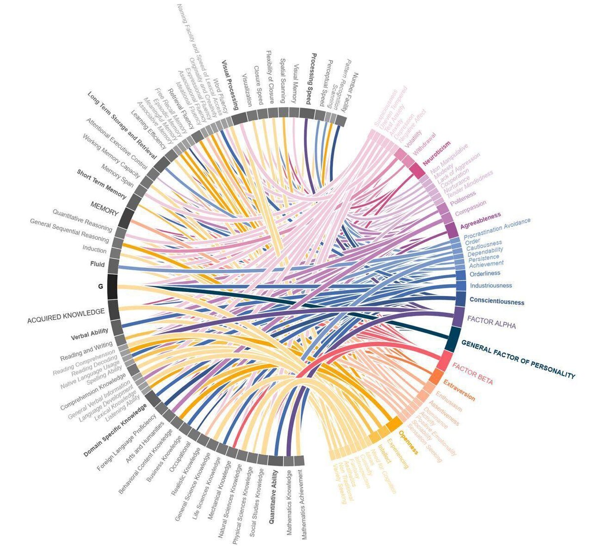 Корреляции между умственными способностями (левая, серая часть кольца) и чертами личности (правая, цветная часть кольца