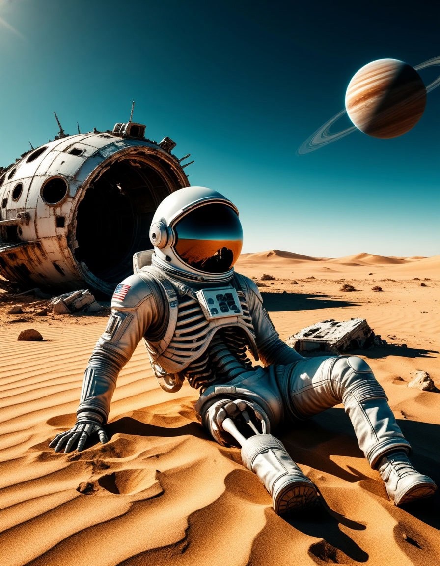 A skeleton wearing an astronaut helmet and suit is lying on the sand, with a crashed spaceship next to him and a one planet and clean blue sky in the background. The image is rendered in a photorealistic hyper-realistic style using Octane. It has a very detailed, cinematic look, with volumetric lighting.
