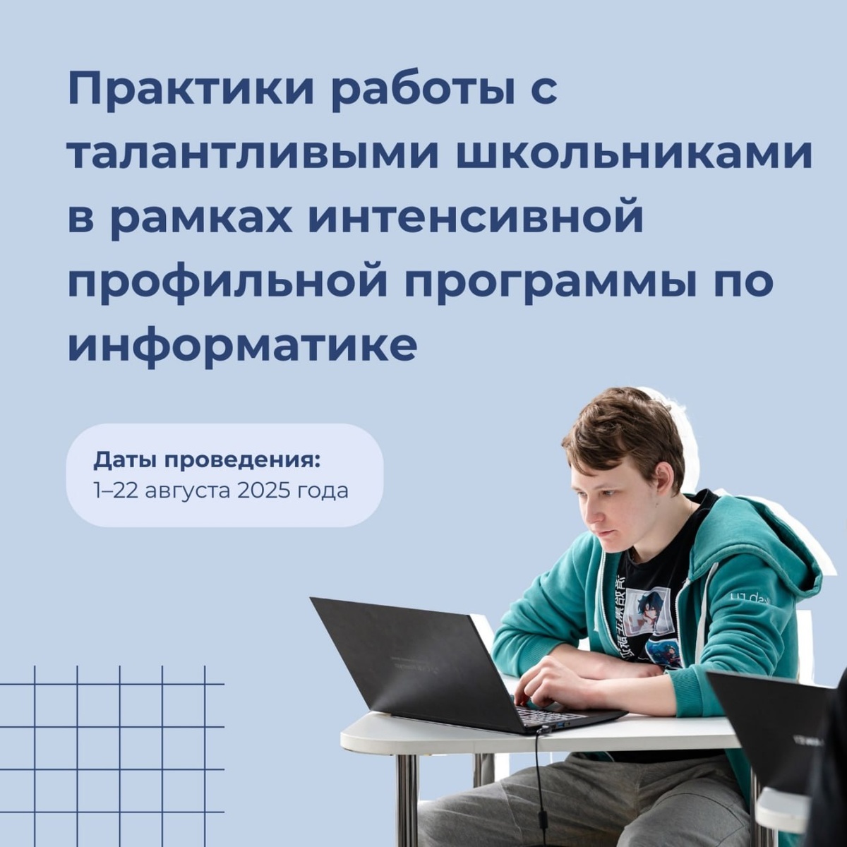 1-22 августа в ОЦ "Сириус" пройдет обучающая программа для педагогов: "Практики работы с талантливыми школьниками в рамках интенсивной профильной программы по информатике" Даты проведения: 1–22 августа 2025 года Стажировка ориентирована на слушателей, ранее прошедших обучение по программам повышения квалификации (в том числе по программам стажировок) по информатике в Образовательном центре «Сириус». Заявки принимаются до 1 июля 2025 года до 23:59 по московскому времени: https://sochisirius.ru/obuchenie/pedagogam/smena2049/9502
