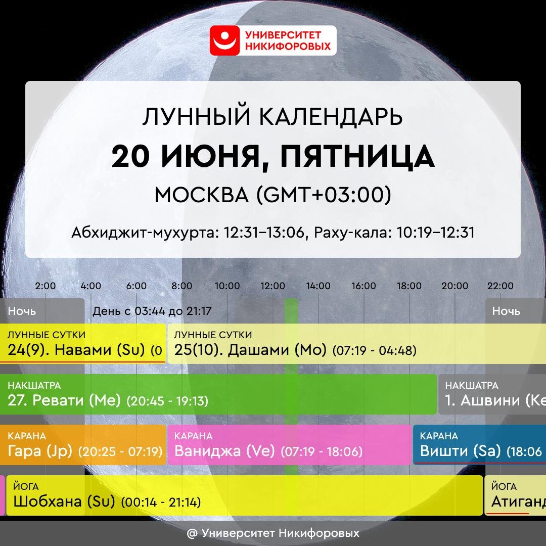 20 ИЮНЯ, ПЯТНИЦА До 7:19 преобладает энергия “пустых рук”, которая поддерживает процессы очищения на уровне тела и пространства. Можно сделать с утра скраб или другую уходовую процедуру. После 7:19 включается благоприятная энергия, способствующая наполнению и питанию – подходящее время для питательной маски. Хорошо совершать покупки и осуществлять продажи продаж, время способствует творческой деятельности, благотворительности. Подходящий момент для посадки и пересадки растений, подкормки и удобрения почвы. В вечерние часы стоит быть внимательнее к своему питанию и эмоциональному состоянию. Травяной чай и расслабляющий душ станут хорошей поддержкой телу и психике. Нежелательно затевать что-то рискованное, особенно поздним вечером.