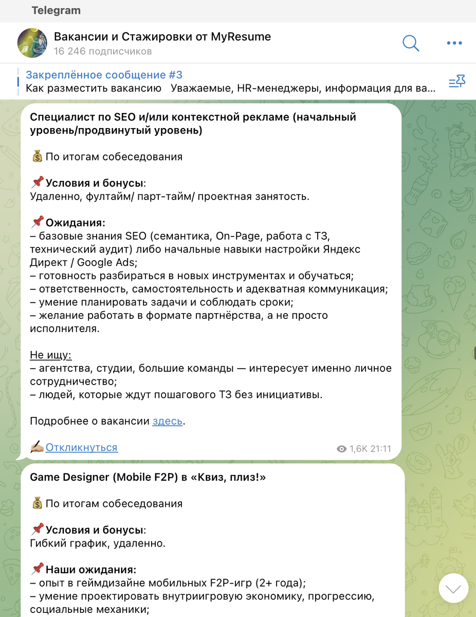 Хорошие вакансии в сфере SEO редко встретишь на сайтах-агрегаторах, а если и повезет, то ответа на свой отклик можно ждать неделями. В Телеграме всё устроено проще – здесь работодатели больше заинтересованы в быстром найме, поэтому в объявлениях оставляют прямые контакты для связи и не прячутся за формальными отписками.