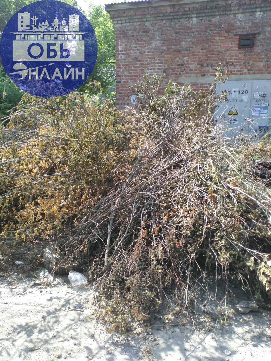 ↗ Администрация города Оби когда и кто должен убрать это безобразие? Совсем мозгов нет, навалили веток возле электроподстанции