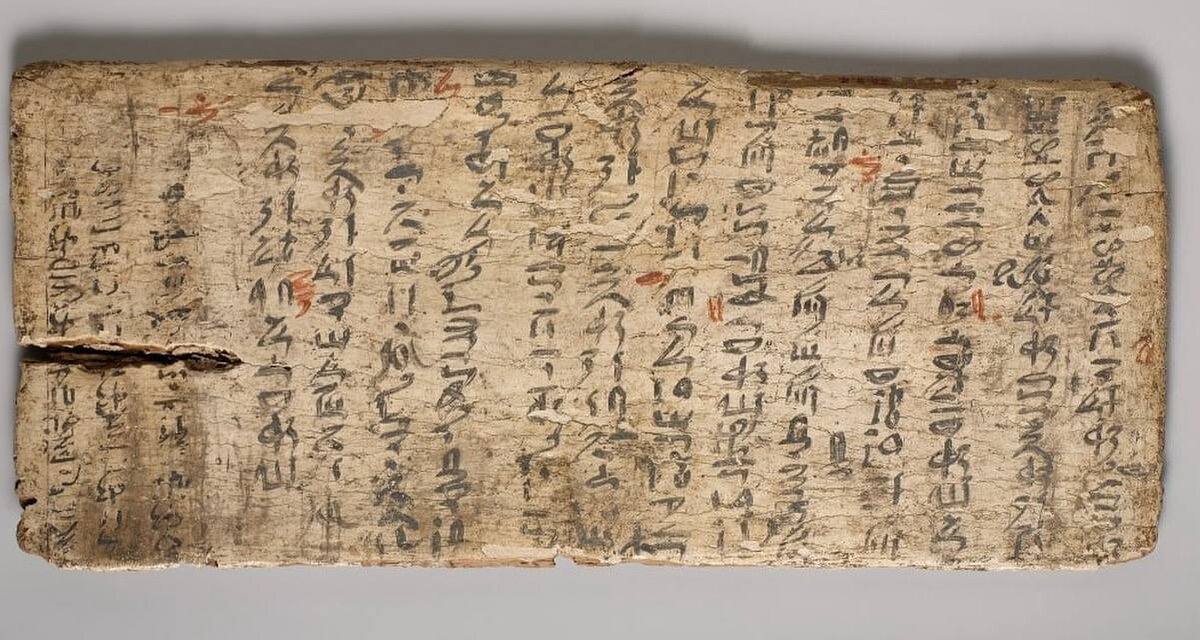 Школьная табличка, не самый лучший ученик написал контрольную работу - как бы письмо к высокопоставленному чиновнику - а учитель красным поправляет грамматические ошибки! Египет, 2000-е до н.э., обучение иератическому письму