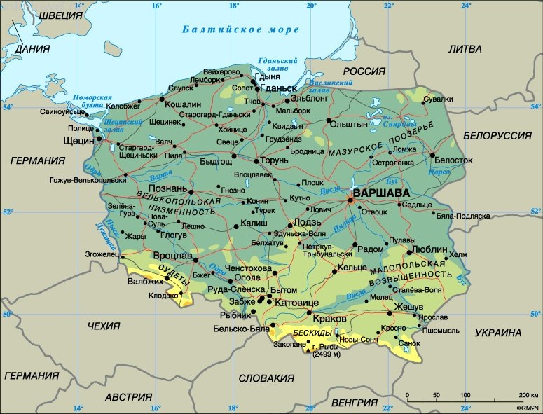 Территория Польши в основном плоская, с обширными равнинами, лесами и множеством рек, включая Вислу — самую длинную реку страны. На юге расположены горы Татры (часть Карпат), где находится самая высокая точка Польши — гора Риси (2499 м). Центр страны покрыт лесами, а на севере протянулся живописный Балтийский берег с песчаными пляжами.