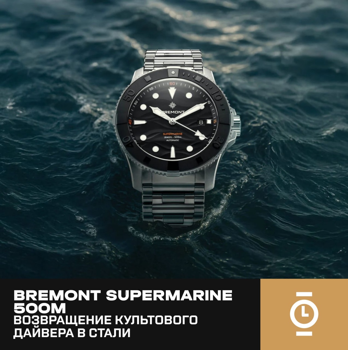 BREMONT SUPERMARINE 500M: ВОЗВРАЩЕНИЕ КУЛЬТОВОГО ДАЙВЕРА В СТАЛИ #новость_WD Британская марка Bremont расширяет линейку Supermarine: после версии в зелёной керамике Jungle Green представлена новая модель в стальном корпусе с чёрным циферблатом, украшенным объёмным волнообразным узором. Корпус диаметром 43 мм выполнен из устойчивой к коррозии стали 904L. Модель оснащена гелиевым клапаном, завинчивающейся крышкой, крупной заводной головкой с защитой и односторонним керамическим безелем с лазерной гравировкой и люминесцентной точкой. Главный визуальный акцент — 3D-циферблат, имитирующий морское дно. Контрастные стрелки и индексы с Super-LumiNova обеспечивают отличную читаемость, а окно даты на 3 часах сливается с чёрным фоном. Яркие детали сведены к минимуму: оранжевые метки на безеле и надписи на 6 часах. Сапфировое стекло с антибликовым покрытием и гравированная задняя крышка с картой океанов завершают образ. Внутри — автоматический калибр BB64AH (на базе Sellita SW300-1A) с частот