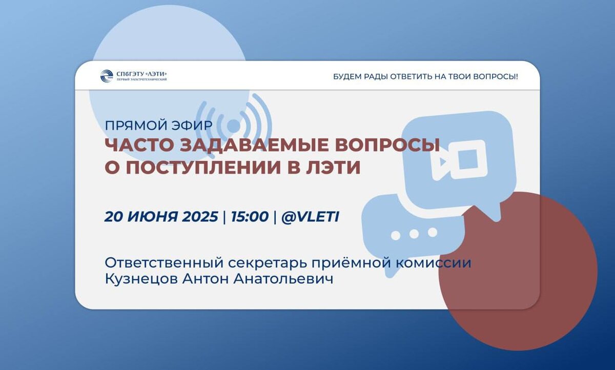 Ответственный секретарь приемной комиссии СПбГЭТУ «ЛЭТИ» ответит на самые популярные вопросы поступающих в прямом эфире.