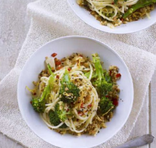 Время приготовления — 20 минут. 2 порции. Уровень сложности — лёгкий. Это блюдо можно назвать низкокалорийным потому что чеснок, чили и лимон добавляют вкуса без необходимости использовать жир. Хрустящие сухари создают текстуру. Ингредиенты: - оливковое масло - 3 тонко нарезанные чесночные дольки - 1 мелко нарезанный длинный красный чили - 20 граммов панировочных сухарей из белого хлеба - цедра половины лимона - 150 граммов (в сухом виде) спагетти - 125 граммов нарезанной на маленькие кусочки брокколи Нагрейте 2 столовые ложки масла в небольшой антипригарной сковороде и добавьте чеснок и чили. Готовьте 1-2 минуты на очень слабом огне, периодически помешивая. Выложите в миску. Поставьте сковороду обратно на огонь и положите в неё сухари. Жарьте на среднем огне 4-5 минут, постоянно помешивая, до появления золотистого цвета. Положите в чили и чеснок цедру лимона и хорошо приправьте. Держите в тепле. Приготовьте спагетти согласно инструкциям на упаковке. Положите брокколи в последние 3 мин