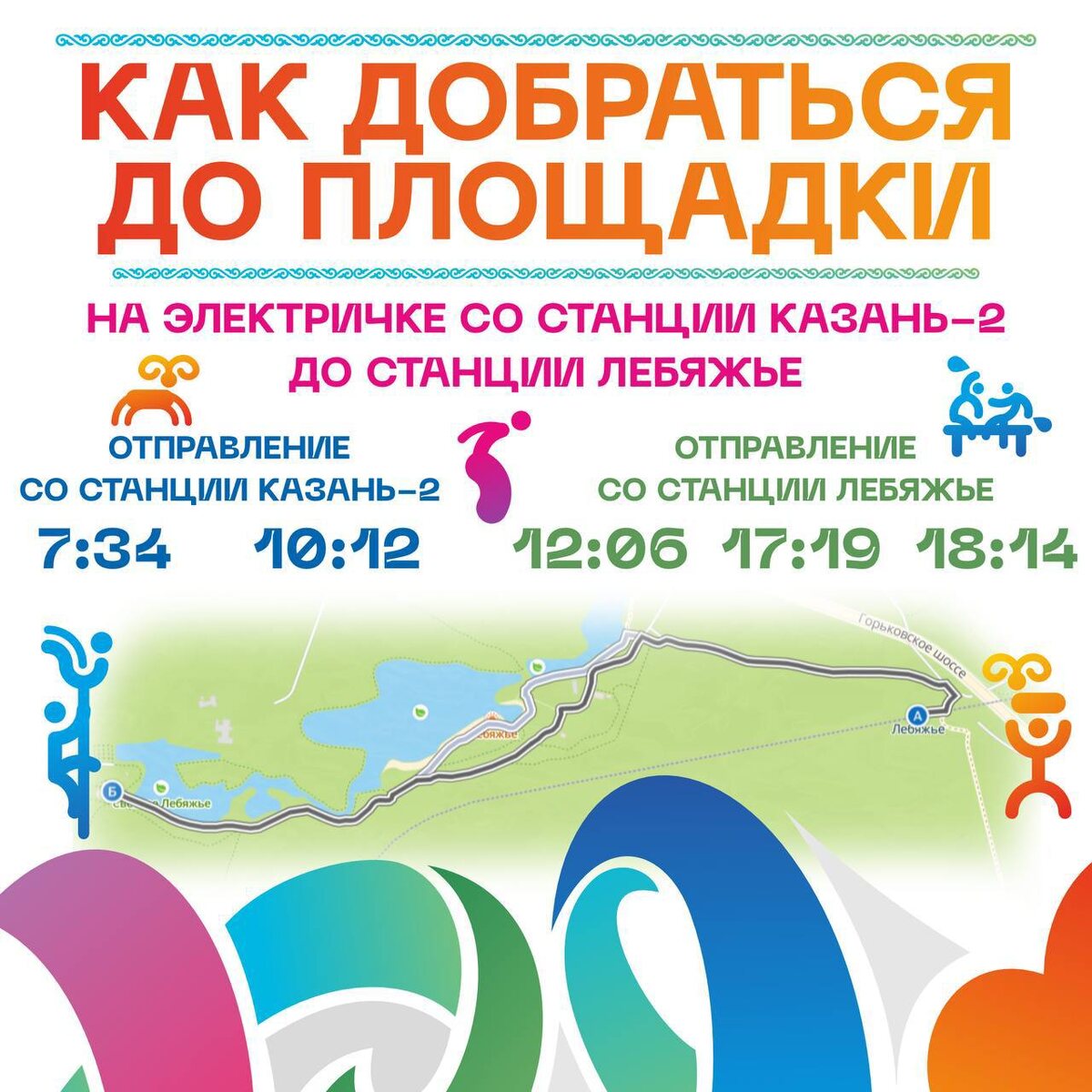 🚌 Как добраться до площадки празднования Сабантуя на Лебяжьем? Сабантуй на Лебяжьем состоится 21 июня Публикуем подробности как доехать до майдана 1️⃣На бесплатных шаттлах. Они отправляются с трех точек: 🔵от парковки гипермаркета «Мегастрой» (Горьковское шоссе, 28). Здесь, на большой парковке, вы можете оставить свой автомобиль и комфортно добраться до площадки. 🔵у остановки общественного транспорта «Жилой массив Ремплер» (ориентир заправка Татнефть по ул. Залесная) 🔵с остановки «Осиново» с остановками, указанными на схеме в карточке⬆️ 🚌 Добраться до точек отправления шаттлов можно на общественном транспорте: автобусах №36, 72, 46. Они будут работать в усиленном режиме, по графику рабочего дня. 🅿️Для автомобилистов парковки организованы: • возле лагеря «Заречье»; • возле лагеря «Солнечный» (не доезжая лагеря, после заправки); • возле лыжной базы «Динамо». 2️⃣На электричке со станции «Казань-2» до ж/д станции «Лебяжье» Расписание электричек смотрите в карточке. @kazandet