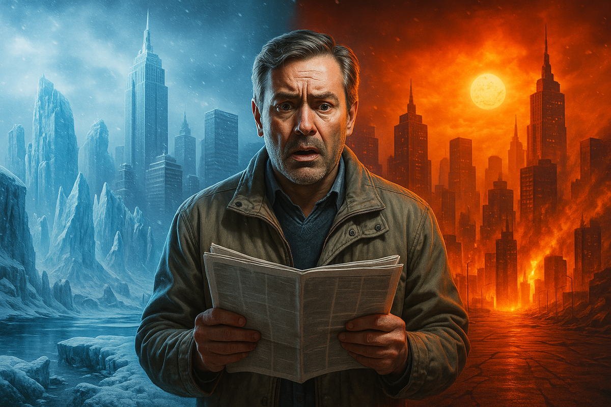 В 1970-х мир всерьёз ждал вечного мороза. «Эксперты заявляют: новая ледниковая эра неизбежна!» — такой заголовок украшал обложку журнала Science & Mechanics в 1975-м. Тогда же дети в Чикаго писали сочинения «Как выживем под снегом». Почему сейчас прогноз ровно обратный? У киоска, март 1975‑го, мужчина дрожащими пальцами берёт газету с криком на первой полосе: «Новая ледниковая эра неизбежна!» Снежная стена воображения мгновенно наваливается на Чикаго, и он мысленно примеряет мех, записывает в блокнот: валенки, консервы, керосиновая лампа. Проходит три десятилетия. Тот же киоск, жарища июля 2005‑го — и новый заголовок: «Планета плавится!» Его давно отданное пальто вспоминается как насмешка. Теперь список другой: вентилятор, льняная рубашка, вера в громкие заголовки под вопросом. С 1945-го по начало 70-х среднеглобальная температура упала на 0,1-0,3. На фоне прежнего потепления это выглядело зловеще. Учёные фиксировали рост аэрозольных выбросов серы: частицы отражали солнце, повышая аль