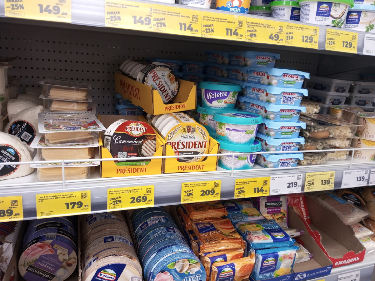Творожный сыр с маринованными огурцами долго был моим фаворитом, интересное сочетание вкусов получается, а со скидкой затраты составят 114 рублей. Из сырных нарезок предлагается "голландский премиум" за 179 рублей, довольно интересный вкус, есть небольшая горчинка, но плавится сыр нормально; за 139 рублей ассорти, где и чечел, и сырные бочонки, вкусно, но затратно.